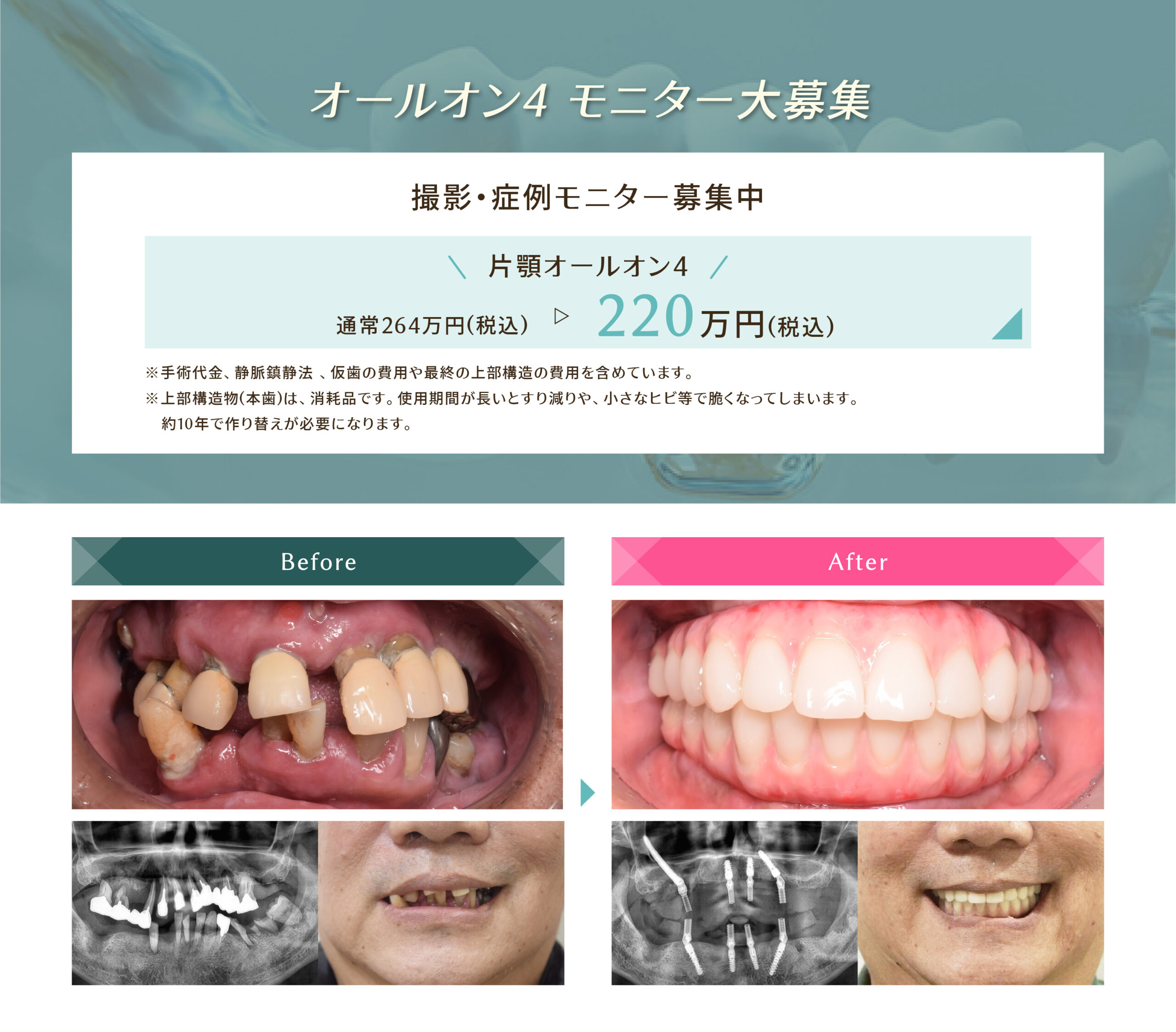 全国的にオールオンフォーをしているクリニックが少ない中で、当院は開院依頼、積極的にオールオンフォーインプラントの治療を行い、これまで多くの患者さんの治療成功を導いてきました。